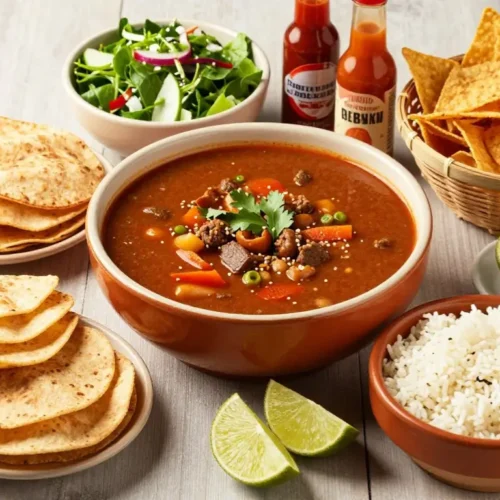 Avocado adds creaminess and helps soften the deeper chile flavor of the broth. Mexican rice is another good option if you are serving a crowd and want to make the meal feel more substantial. If you want something lighter and fresher on the table, a crisp spring salad recipe can be a nice contrast to the rich broth.