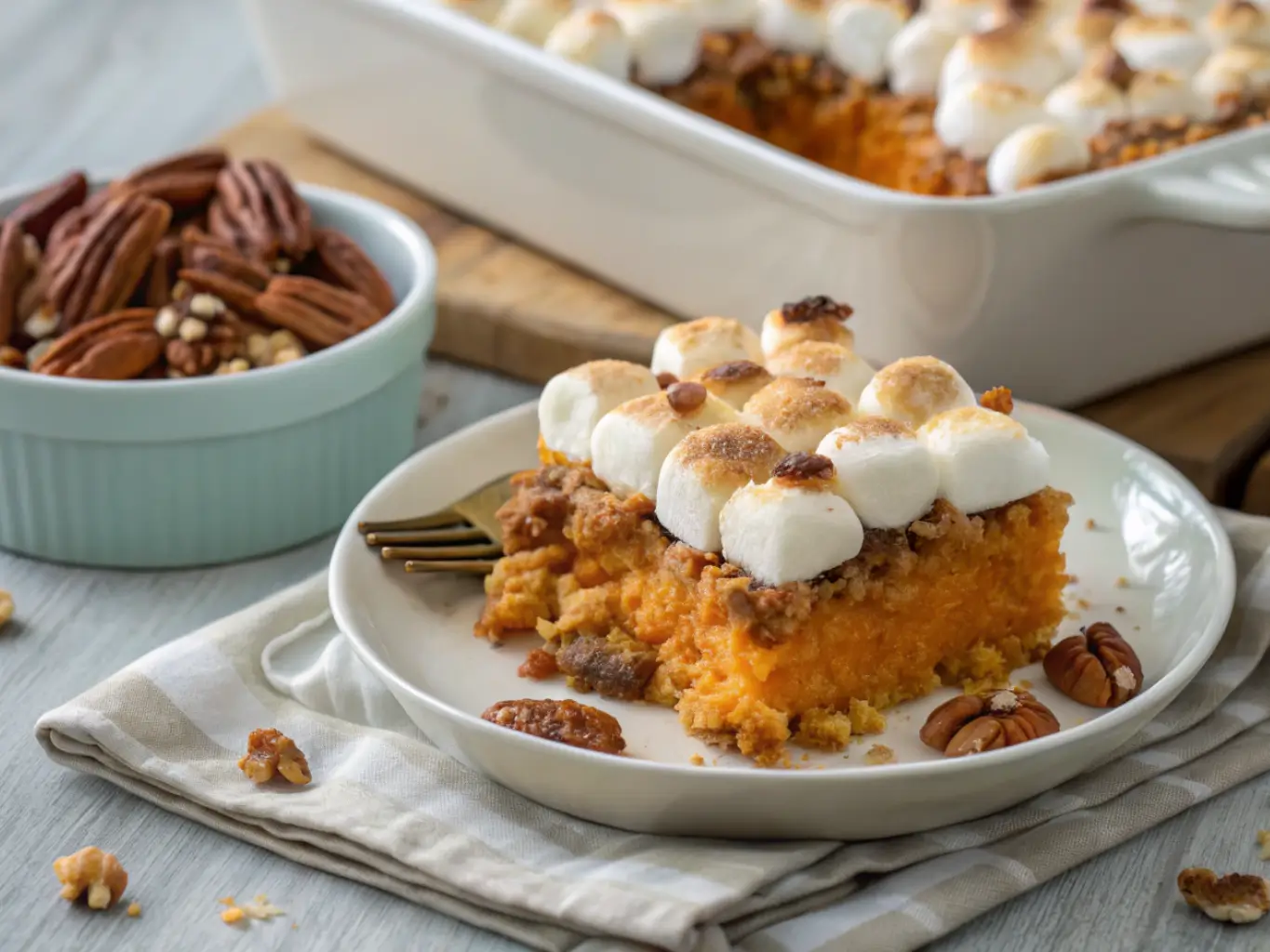 - Add marshmallows (optional): If using marshmallows, remove the casserole from the oven, sprinkle the mini marshmallows over the top, and return to the oven for 8–10 minutes, or until the marshmallows are puffed and lightly golden. For deeper browning, broil for 1–2 minutes, watching closely so they don’t burn.